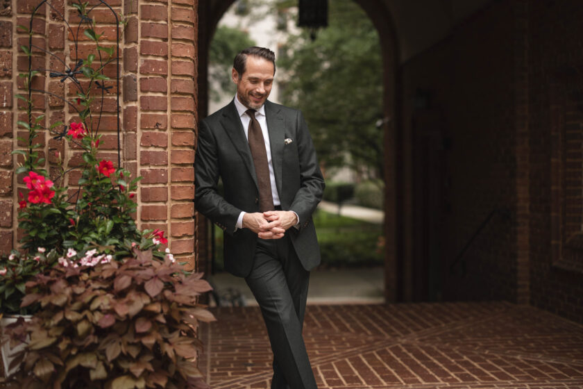 Well, the answer to that question when it comes to styling a suit simply, is to choose a white shirt and complementary tie. Here, I’ve put that advice into practice with our white poplin dress shirt and brown grenadine tie. It’s a timeless approach that plays into the color and feel of the season in a way only possible with this particular suit.