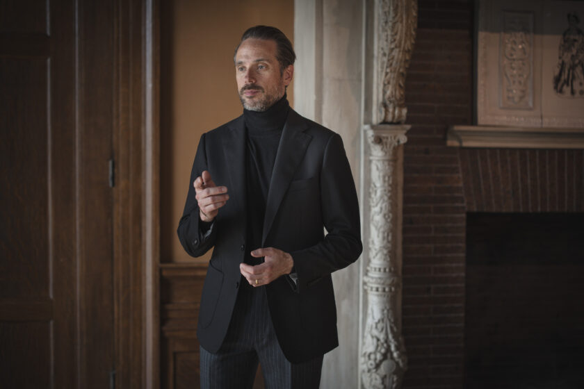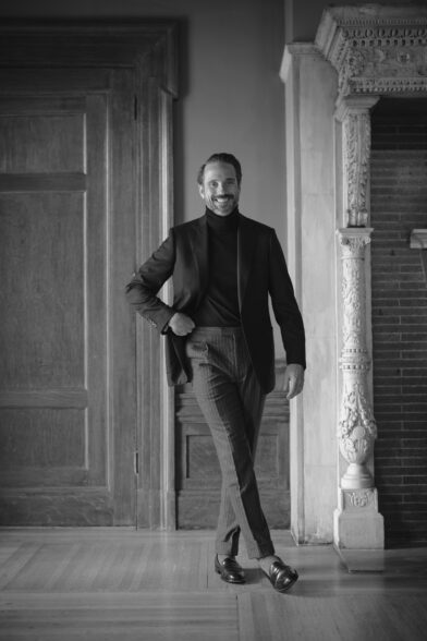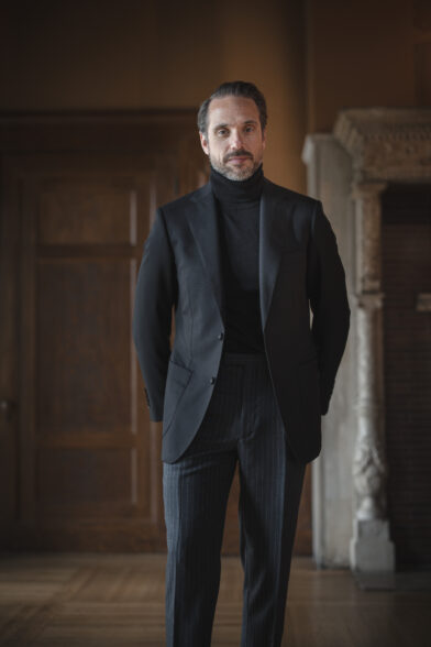 For the foundation of the outfit, I paired a black cashmere turtleneck with a pair of chalk stripe flannel trousers. The turtleneck instantly lends a feeling of relaxed sophistication and the chalk stripe trousers provide a subtle and unexpected pattern to augment the texture of the jacket. And I’m anchoring the look with my favorite pair of black cordovan full straps from Alden.